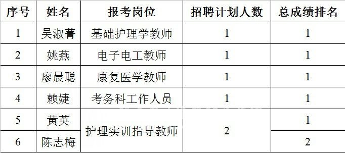根据市卫计委《市直医疗卫生单位招聘编外工作人员规程》和《华体汇官网首页进入2016年面向社会公开招聘非编工作人员公告》规定,我院于2016年9月23日对教学岗、考务科工作人员岗和实训指导教师岗应聘人员进行了考核,依据考核结果,现将入闱体检政审人员名单公布如下: