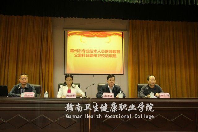 11月4日下午2:50分,赣州市人社局培训中心在我校学术报告厅举行了赣州市专业技术人员继续教育公需科目赣州卫校培训班开班仪式。赣州市人社局副局长王孝友莅临培训班、并做了重要讲话,赣州卫校校长林莉出席培训班、副校长赖晓琴代表学校做了表态讲话。培训班仪式由赣州市人社局培训中心主任刘上海主持,赣州卫校230余名专业技术人员参加了培训班。