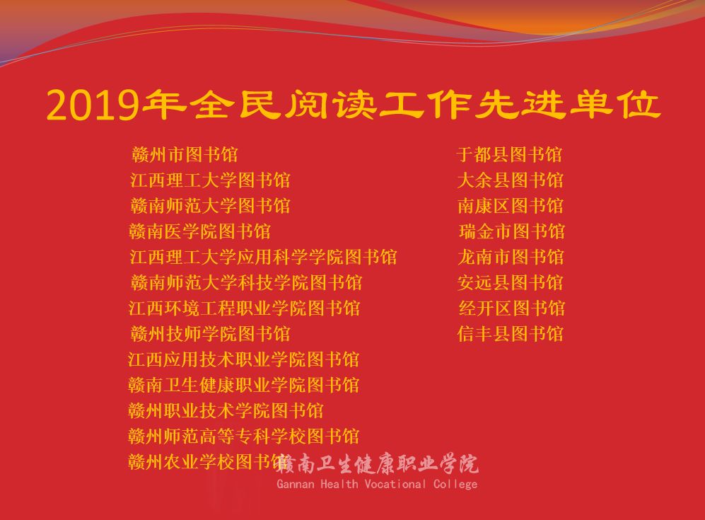 2019年,我院图书馆深度开展阅读推广工作,每月举办主题活动,不断创新活动内容和形式,积极发挥全民阅读主阵地作用,引领了校园文化建设,推动了学校图书馆事业健康发展,荣获赣州市图书馆学会表彰为“2019年全民阅读工作先进单位”。