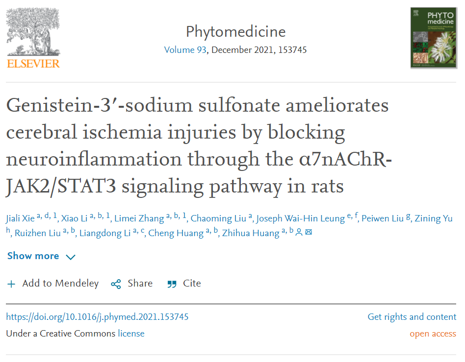 近日,我院医学基础部教师谢佳丽在国际权威期刊Phytomedicine(IF=5.340)在线发表了题为“Genistein-3′-sodium sulfonate ameliorates cerebral ischemia injuries by blocking neuroinflammation through the α7nAChR-JAK2/STAT3 signaling pathway in rats(染料木素磺酸钠通过α7nAChR-JAK2/STAT3信号通路抑制神经炎症减轻大鼠脑缺血损伤)”的研究成果。该研究揭示了染料木素磺酸钠(GSS)治疗缺血性中风的新分子机制,及GSS的下游信号α7nAChR-JAK2/STAT3也可能是治疗 I/RI 的潜在靶点。该研究提出了GSS治疗中风患者的可能性。